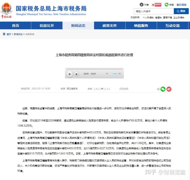 在去年以來開展的文娛領(lǐng)域稅收綜合治理中,通過稅收大數(shù)據(jù)分析發(fā)現(xiàn),鄧倫存在涉嫌偷逃稅問題,且經(jīng)稅務機關(guān)提醒督促仍整改不徹底,遂依法依規(guī)對其進行立案并開展了全面深入的稅務檢查。